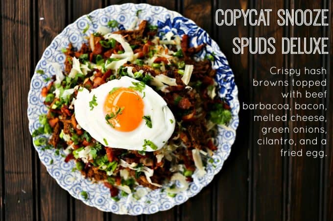 - Copycat Snooze Spuds Deluxe can be a one-pan dish, quite easily. Just be sure to use a nice, heavy-bottomed skillet (preferably cast-iron) to first fry up your bacon, drain all but the necessary amount of fat to cook your hash browns, fry your hash browns, transfer to a plate and top with the grated cheeses, swipe the pan clean, then add the beef barbacoa to the pan to heat and crisp around the edges. Once you’ve topped the hash browns with the barbacoa and crumbled the bacon over the works, you can assess the pan. If it looks like a literal hot mess, you can either wipe it down carefully and add fat to cook your eggs, or grab a small, clean skillet to cook picture perfect eggs. I opted for the small, clean skillet because I have a thing for pretty eggs.