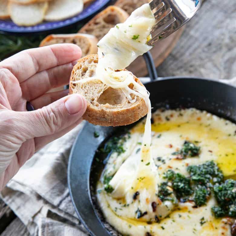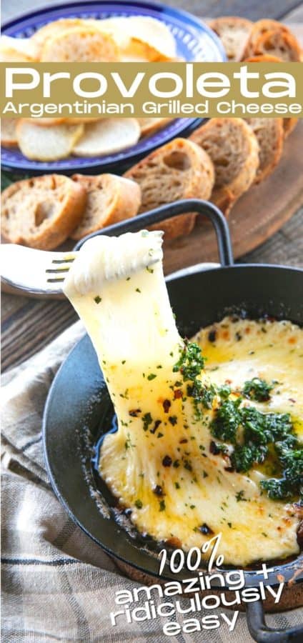 Picture yourself in front of a skillet filled with melted provolone cheese cooked on the grill. It has crispy edges , a little scattering of crushed red pepper flakes, and is drizzled with a little fresh homemade chimichurri.