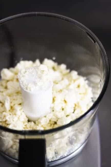 - Fit your food processor with a metal blade and pulse the feta cheese until it is completely broken up into tiny crumbs. It should look like this: