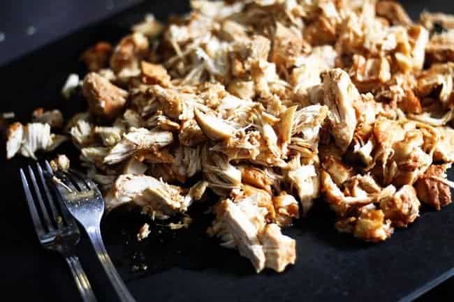 Cutting the chicken thusly serves another purpose, too, though. It sets it up for shredding more quickly and into more manageable bite sized pieces. See? This is the chicken straight from the slow-cooker.